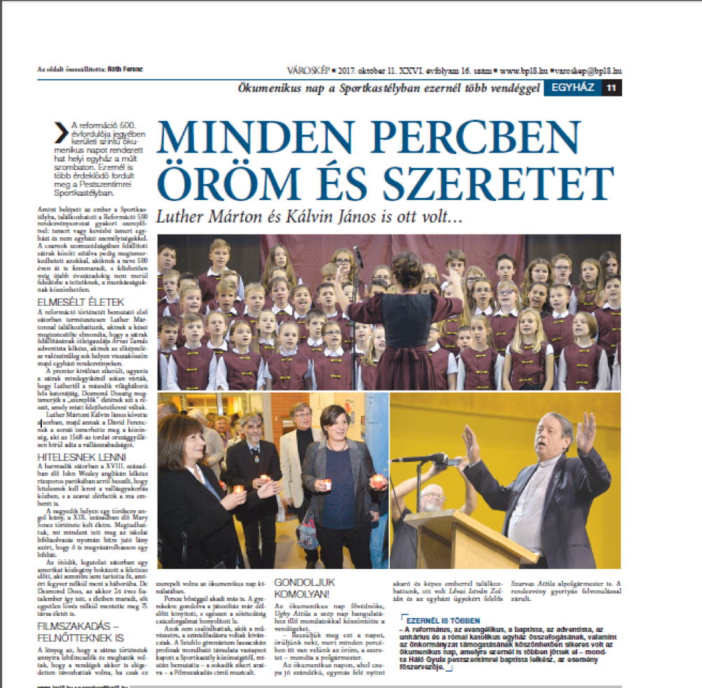 Az egész évben megrendezett programjainknál szem előtt tartottuk, a PRE Soli Deo Gloria Alapítvánnyal közösen a “Vissza a gyökerekhez” idei mottónk megvalósulását. A reformáció 500. program sorozattal a kerek évfordulójának méltó megünneplése és a hitélet iránt érdeklődők, keresők és aktív tagok megszólítása, és a reformáció gazdag örökségének felmutatása volt az elsődleges célunk a kerületben élők számára. A Református Templom előtt az 500 éves reformációt bemutató busz, adott lehetőséget arra, hogy több száz gyermek megismerhesse a nagy reformátorokat, a főbb eseményeket, melyek a mai hitélet gyökerei. Az október 7-i ökumenikus kiemelt rendezvényen, több felekezet is képviseltette magát a 18. kerületből, s mindenki egy-egy érdekes programot támogatott, hogy a több. mint 1500 érdeklődő egy tartalmas, élmény gazdag programon tudjon részt venni. A programok színvonalas megvalósulásához nem csak önkénteseink segítsége, de a Soli Deo Gloria Alapítvány is nagymértében hozzájárult, így pályázati támogatottságának köszönhetően fellépett a Korál-sziget zenekar, akiknek dalai kiválóan ötvözik a reformáció korában született zenei kincseinket a mai zenei hangzásvilággal valamint egyéb családos programok megvalósulását is segítette.
